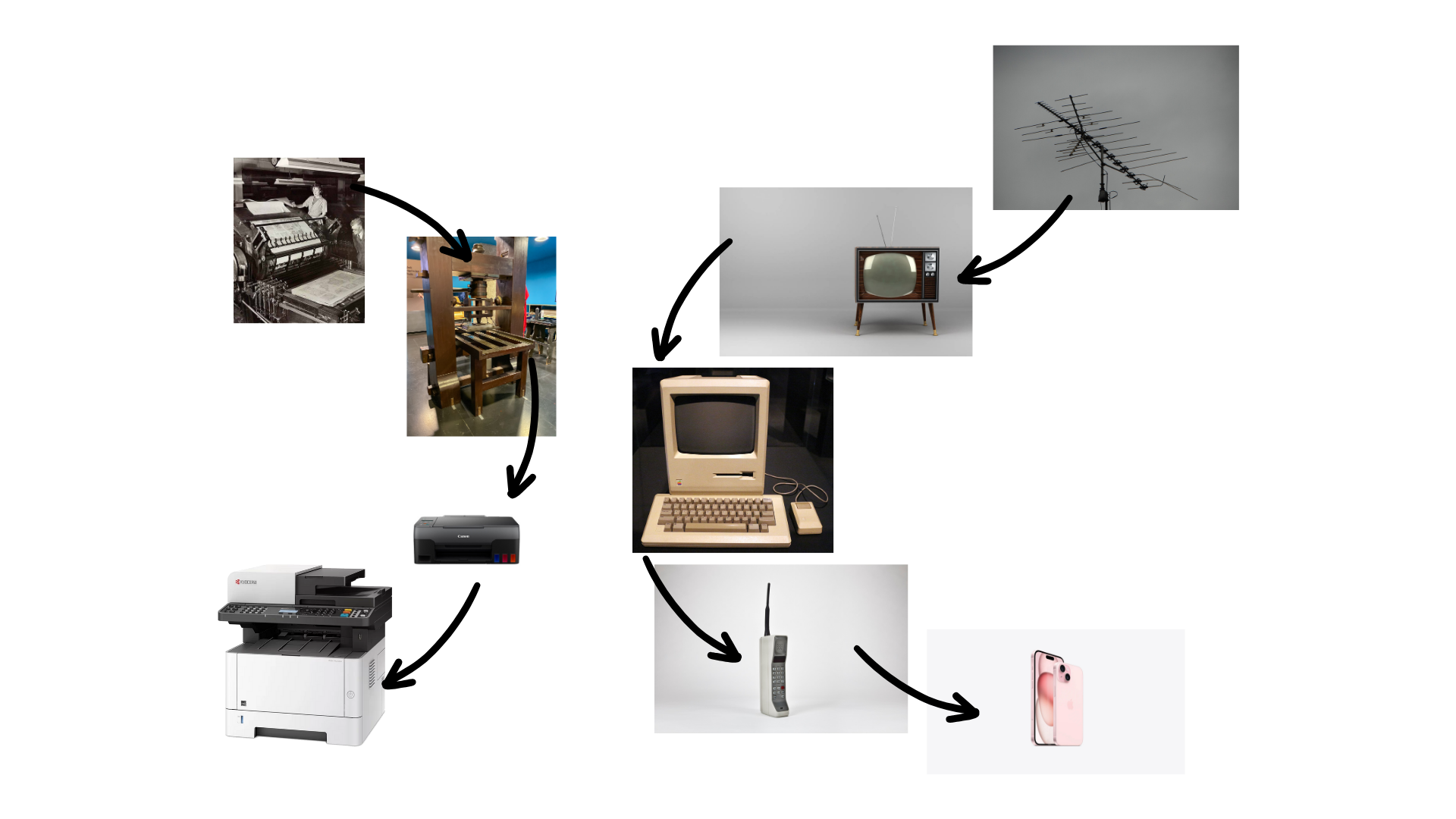 The thought process behind this mood board is to show how communication technology has evolved over the passage of time. Something I wanted to capture with this mood board, however, wasn't just the simple evolution of communication technology but also the paths that it has split up. Traditionally, communication technology was purely reliant on physical, printed words. But as time has continued, rather than saying that printing has evolved to digital, it's more like they've split into two directions: physical and digital. Hence, that has led me to create the two different evolution paths.