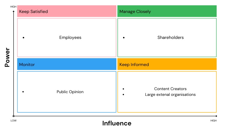 This stakeholder map is a way to visually depict the stakeholders impacted by the recent data breaches on the Twitter / X platform. This map has two axes—those who have direct power over the platform and can control things like security. Then, the other axis displays how much influence these groups might have over the platform or at least impact the potential changes that Twitter / X could make towards remedying the issues that have occurred.